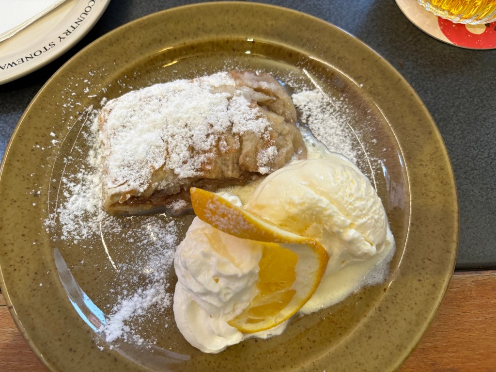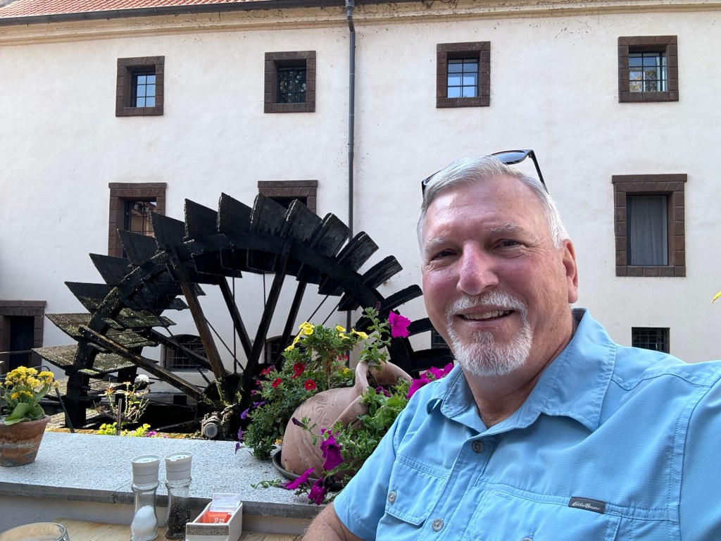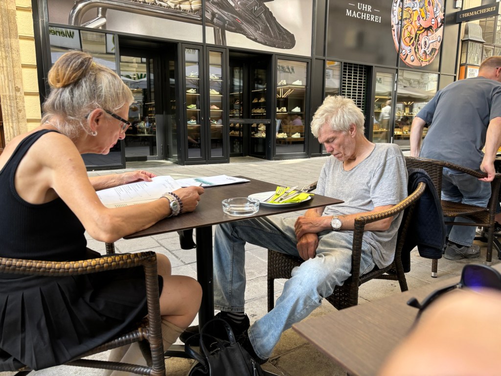 I enjoyed dinner at an outdoor cafe on a beautiful, warm, late summer evening. Ham with mustard and horse radish, salad, bread, and beer. And warm apple streusel with ice cream for dessert. It’s hard traveling…