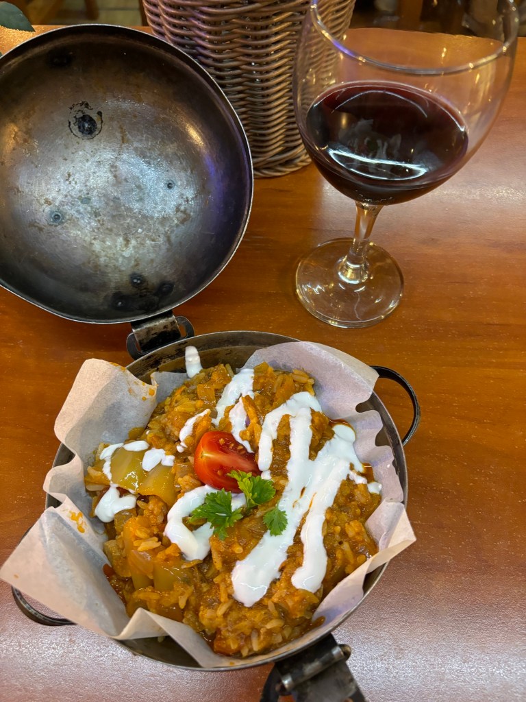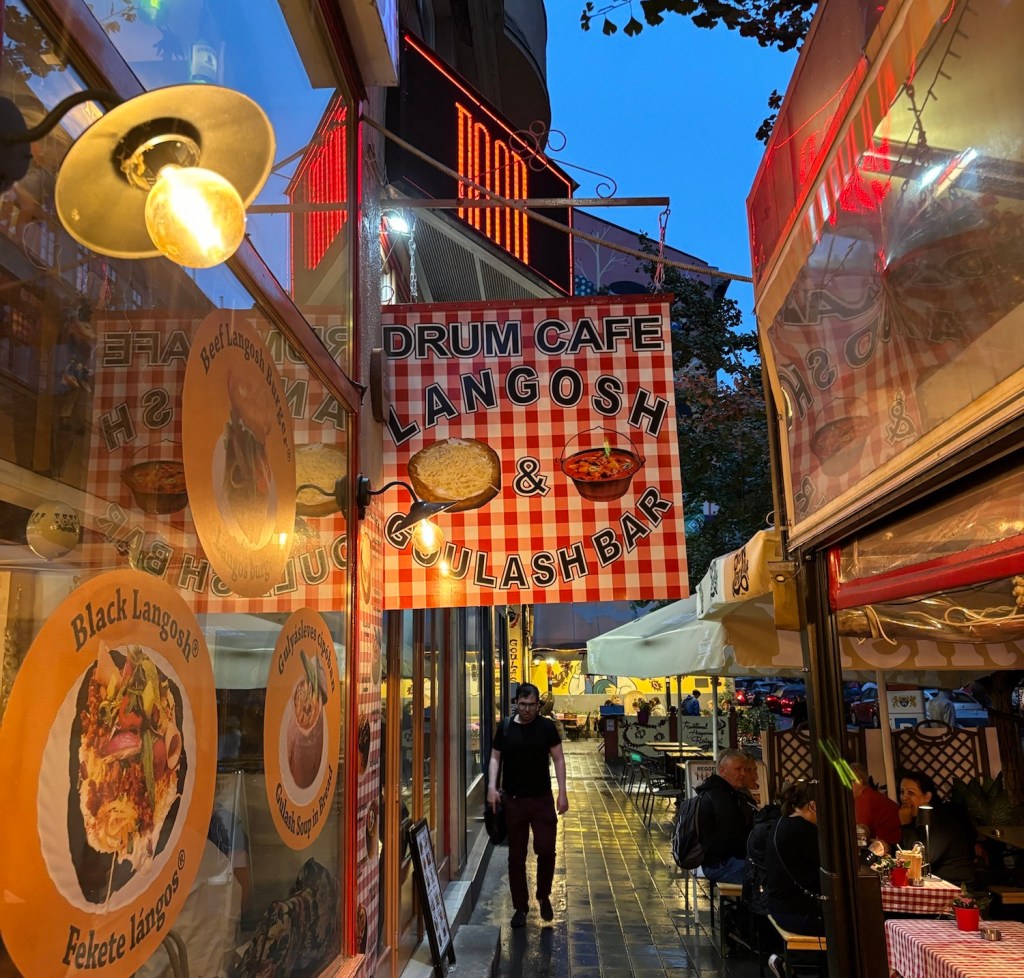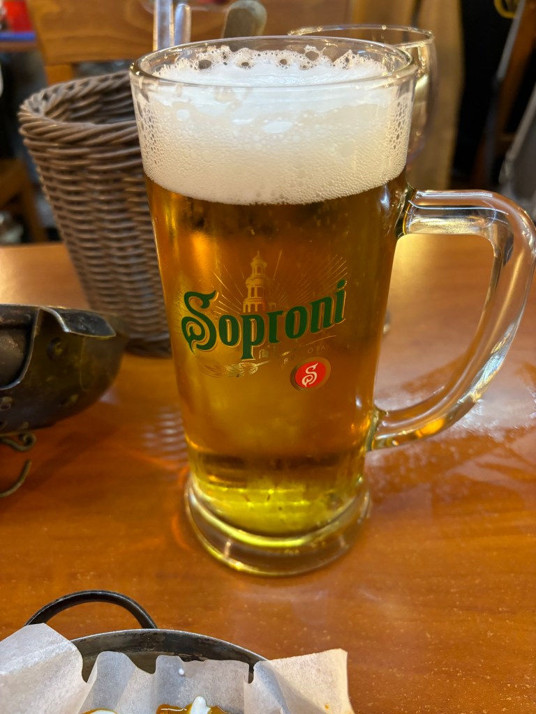 I tried to wash it down with a not-so-good red house wine (should have known at $1.25 a glass!). Nothing beats the cheap table wines in Spain! So I switched to an excellent beer, Soproni Classic, a traditional Hungarian lager. (Web description: Medium body with a malty flavour and thick white head, ending on a smooth finish with grassy notes.). La de da.