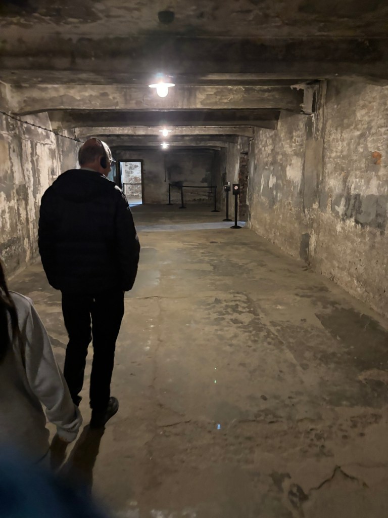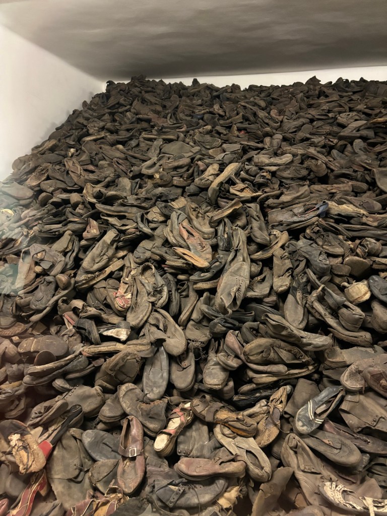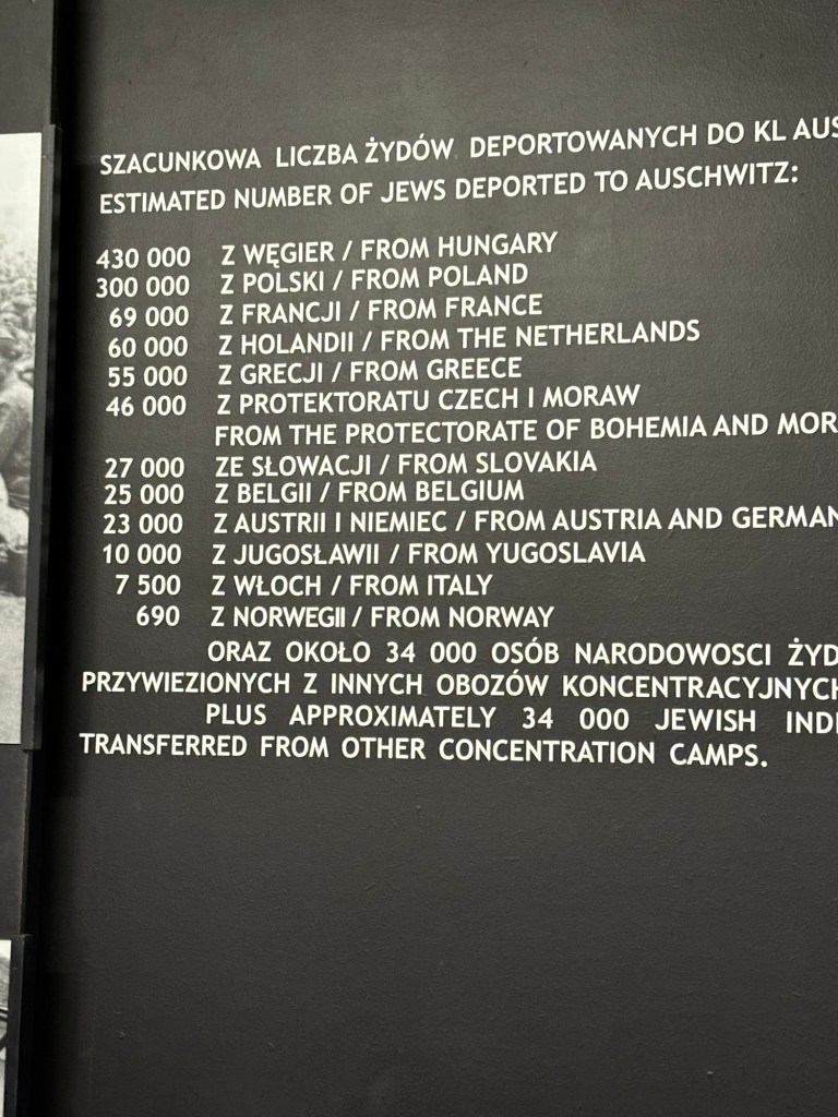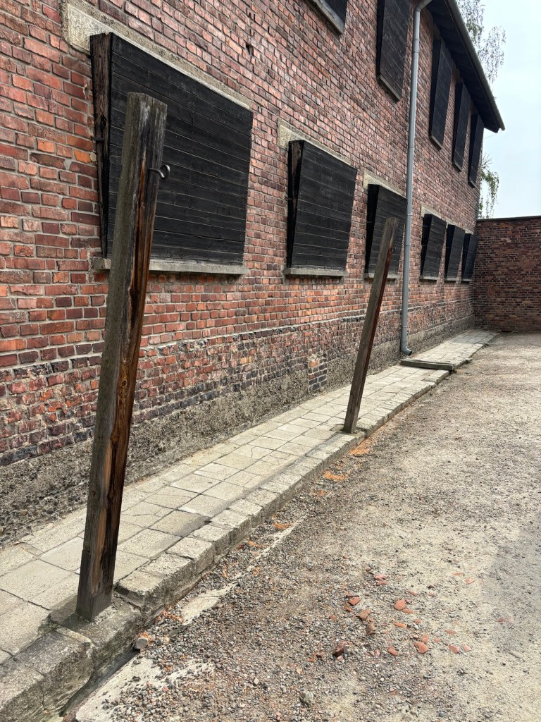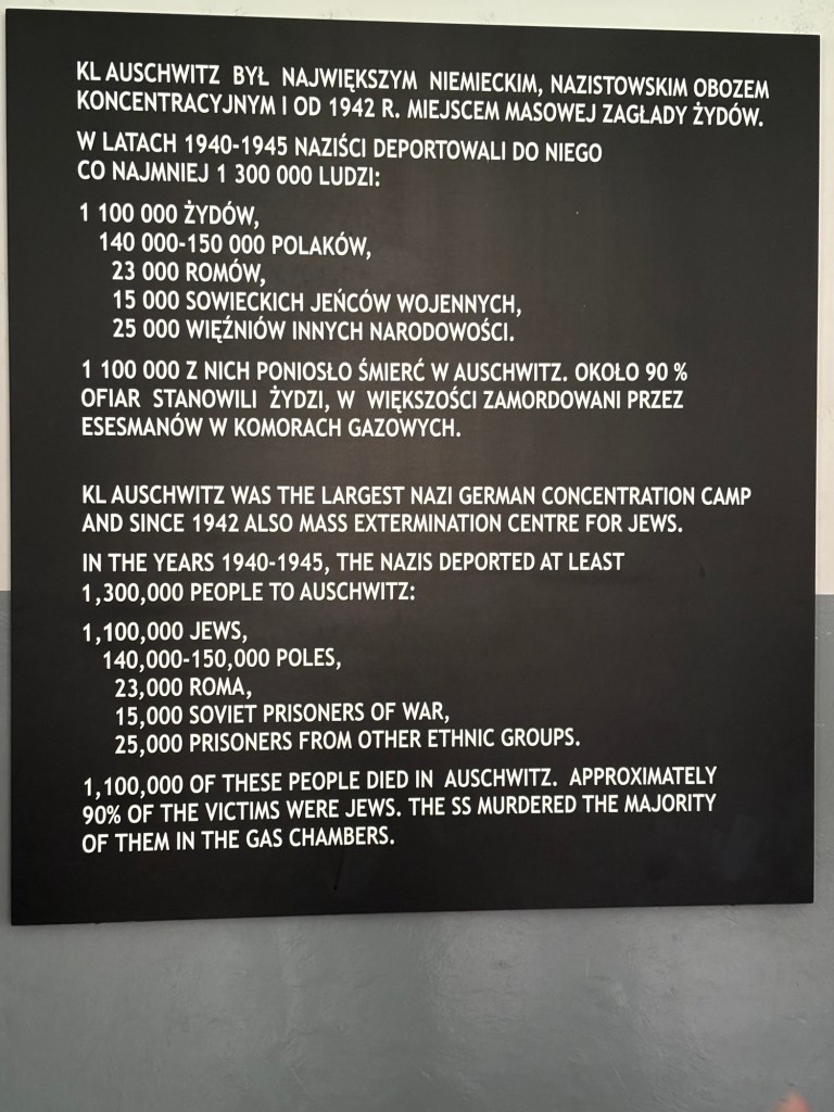 The “Arbeit Macht Frei” GateOur Educator / GuideThe prisoners coming off the train have been separated. See the women and children to the left and men (workers) to the right. The group in the left are soon to be in the gas chambers.See all the belongings left on the siding for the unaware prisoners to get their “shower and disinfecting“Burned GlassesPots and PansProsthetic DevicesPrawn ShawlsShoesLuggageMany wrote their name and number on items so they could be reunited after their “shower”Hands tied behind their back and hooked on the polesWood over the windows in the adjacent barracksThe firing squad wallUp to 12 hangings at a timeThe gas chamber (black top) with mounded dirt surrounding, and the chimney on the adjacent crematoriumGas Chamber entranceA gas chamber for up to 700 people at a timeOne of the hatches in the ceiling where the guards would drop down the gas pelletsThe first commandant of Auschwitz, SS-Obersturmbannführer Rudolf Höss, who was tried and sentenced to death after the war by the Polish Supreme National Tribunal, was hanged here on 16 April 1947. (Adjacent to the Auschwitz gas chamber)