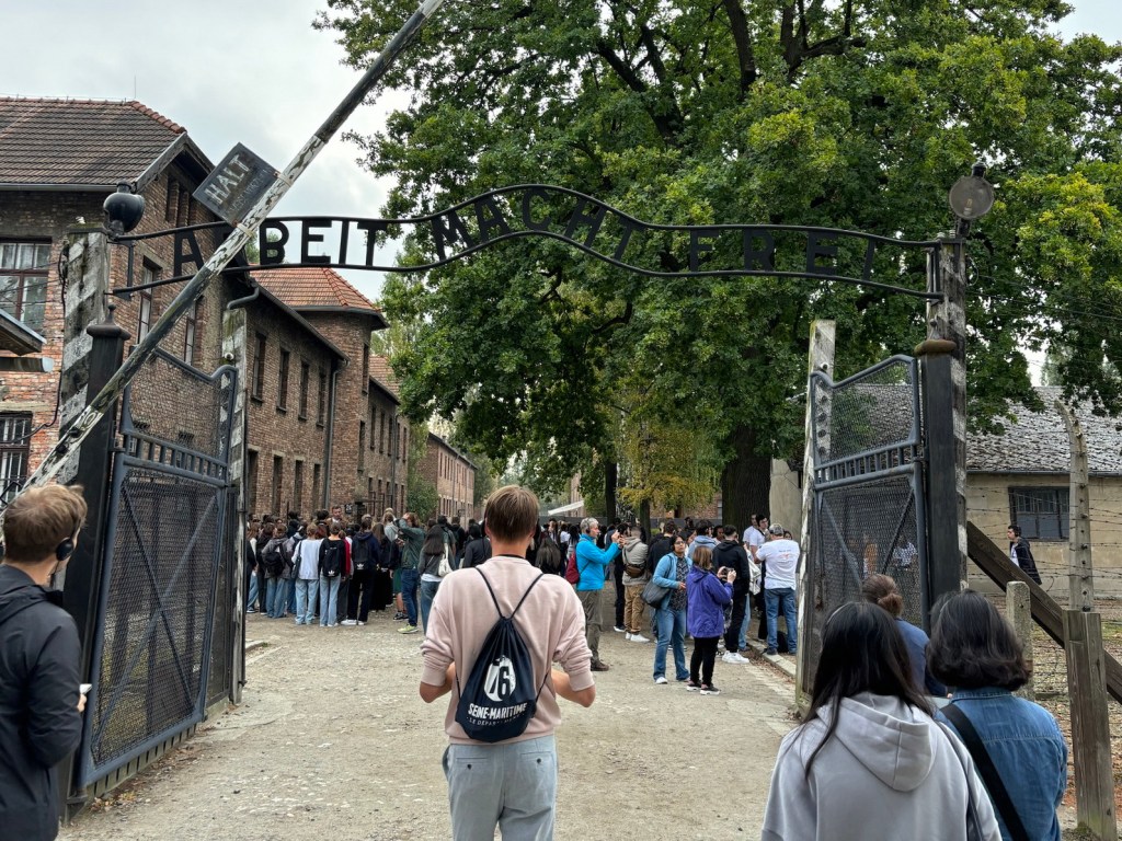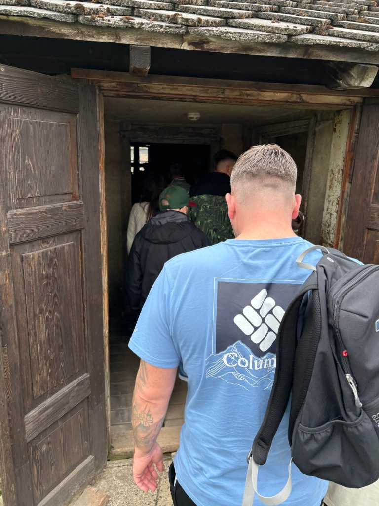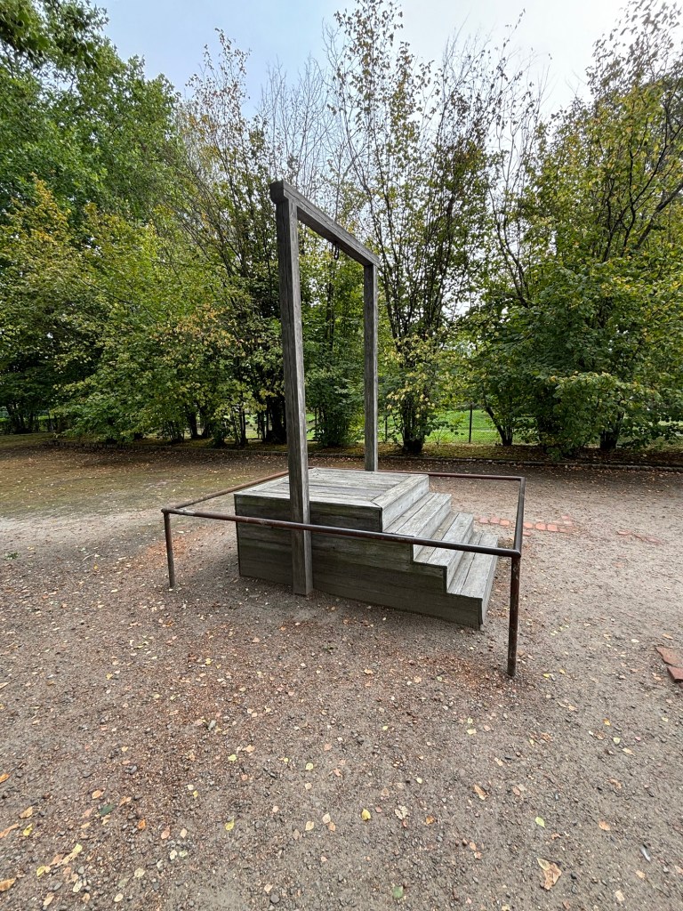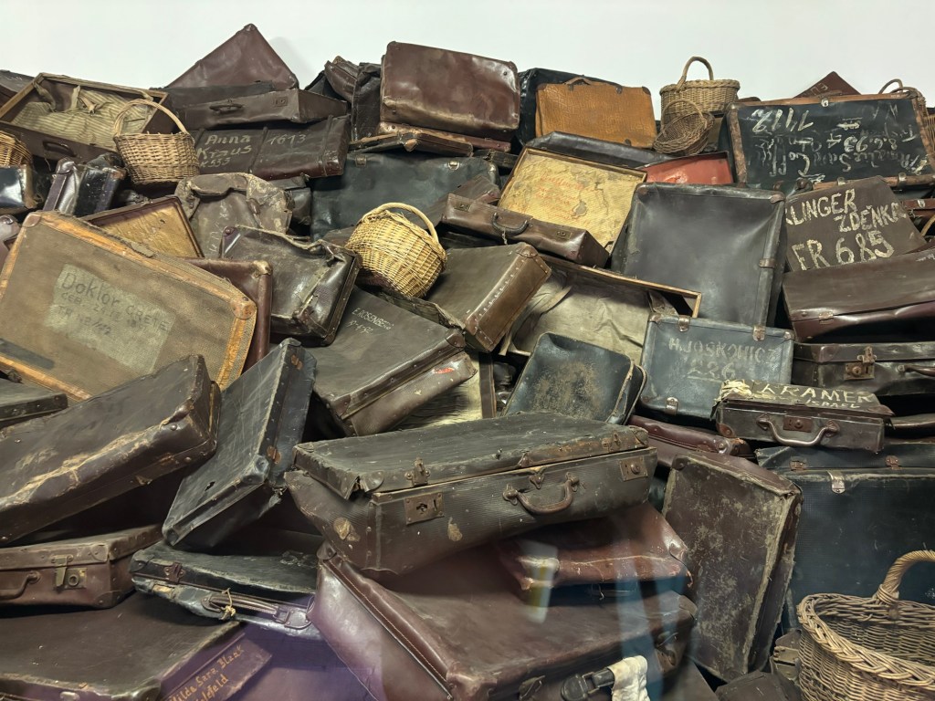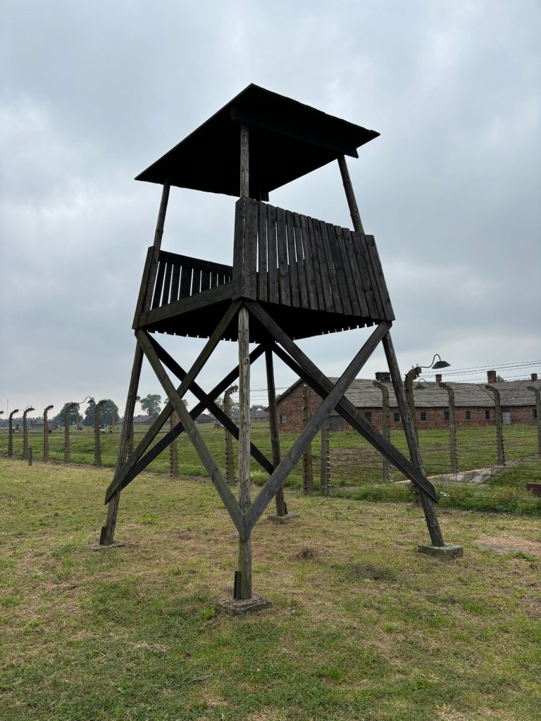The “Arbeit Macht Frei” GateOur Educator / GuideThe prisoners coming off the train have been separated. See the women and children to the left and men (workers) to the right. The group in the left are soon to be in the gas chambers.See all the belongings left on the siding for the unaware prisoners to get their “shower and disinfecting“Burned GlassesPots and PansProsthetic DevicesPrawn ShawlsShoesLuggageMany wrote their name and number on items so they could be reunited after their “shower”Hands tied behind their back and hooked on the polesWood over the windows in the adjacent barracksThe firing squad wallUp to 12 hangings at a timeThe gas chamber (black top) with mounded dirt surrounding, and the chimney on the adjacent crematoriumGas Chamber entranceA gas chamber for up to 700 people at a timeOne of the hatches in the ceiling where the guards would drop down the gas pelletsThe first commandant of Auschwitz, SS-Obersturmbannführer Rudolf Höss, who was tried and sentenced to death after the war by the Polish Supreme National Tribunal, was hanged here on 16 April 1947. (Adjacent to the Auschwitz gas chamber)