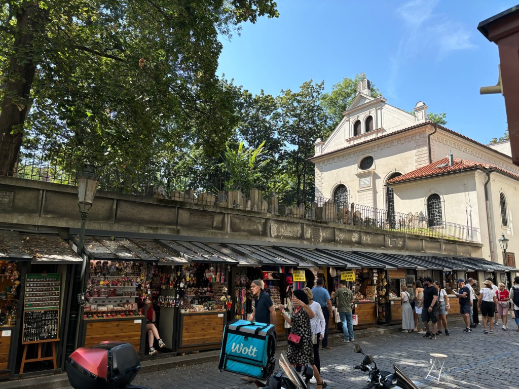 It’s interesting that many of the shops, bars, homes, hotels, churches, etc., especially in Old Town Prague have 2-3 levels below street level. Due to flooding from the river, the roadways had all been elevated by adding dirt and rocks up to 30 feet deep. So in many cases you can walk down into buildings, or have to walk down a level or two to find the bathrooms in many establishments. The Old-New Synagogue mentioned below is an example of that – you actually walk down two flights of stairs from the street to get to the synagogue’s main floor.
