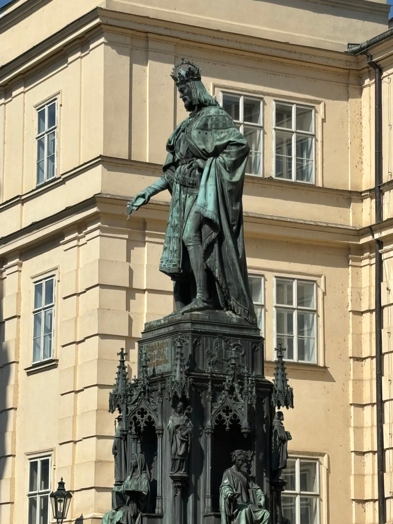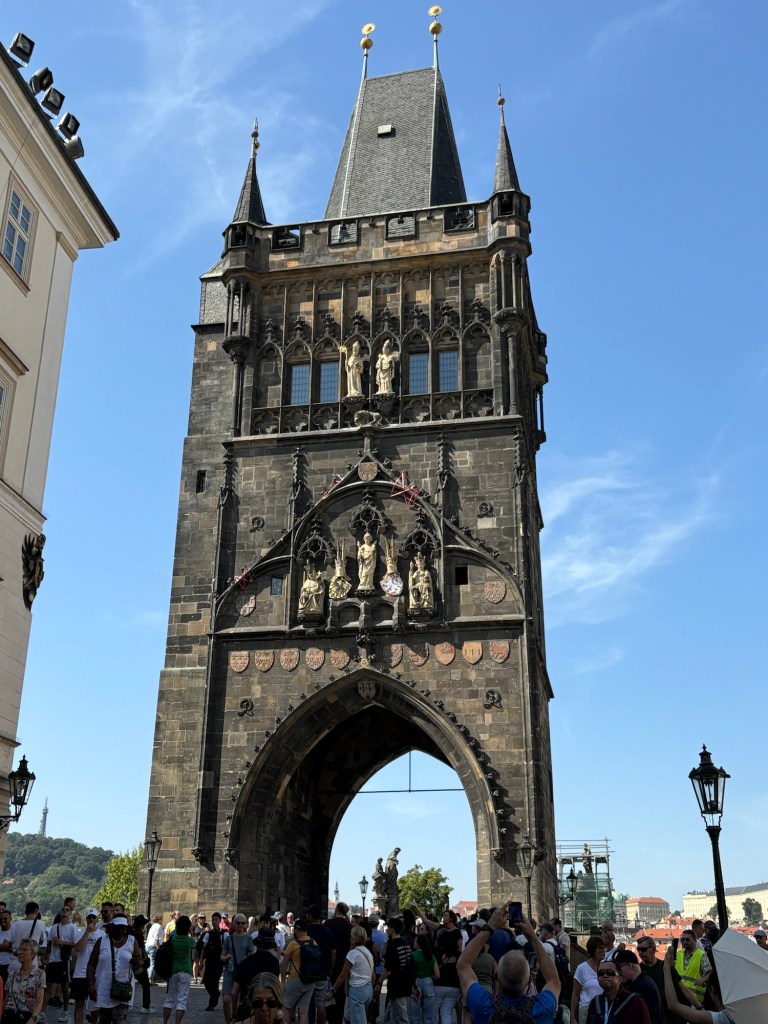 Heading toward the Charles BridgeKing Charles IVOne of the two tensing gates to the city, this one as you cross the Charles Bridge into PragueWalking across the Charles BridgeThe image of the martyred St. John, with five stars. He was thrown off the bridge and drowned.Prague Castle on the bluff above the river and the city – it encompasses all within the line drawn. It’s massive!