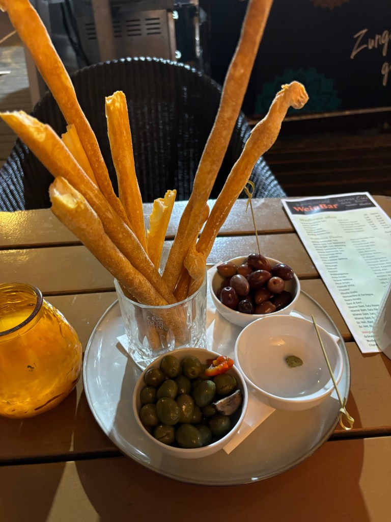 For dinner I hit a riverside cafe for a bit of an odd combo: olives and breadsticks, along with Thai beef, vegetables, and rice, washed down with two bottles of water. Good, but not great. I’m going for pizza tomorrow!