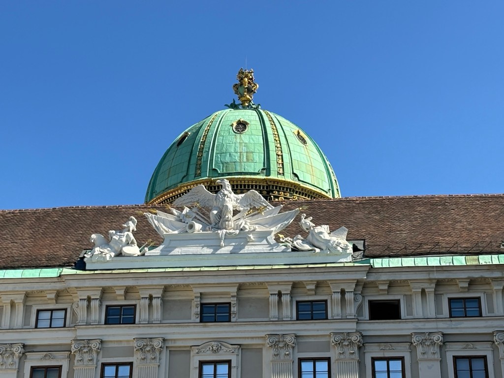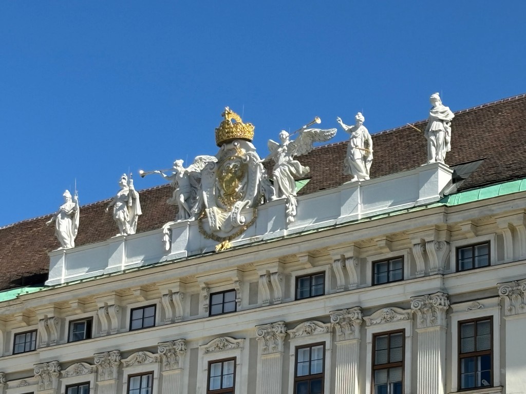 A replica of the crown of the Holy Roman Empire on the side of one of the grand palaces at Hofburg Castle.