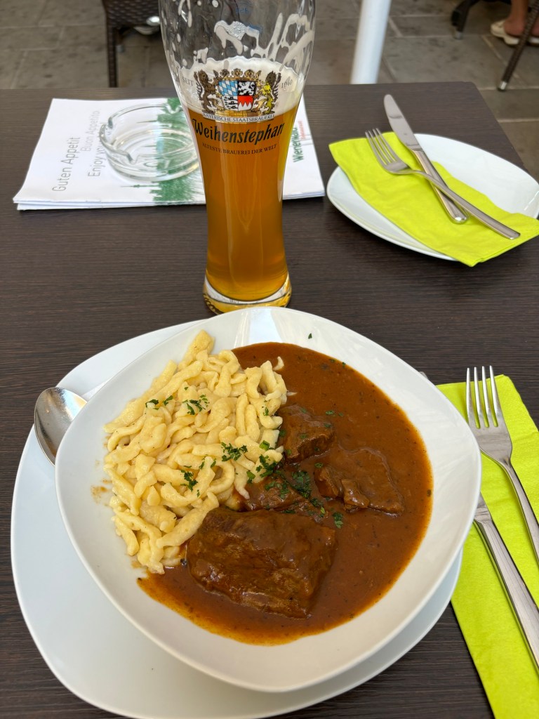 At an outdoor cafe, I enjoyed some delicious Austrian goulash and a beer.