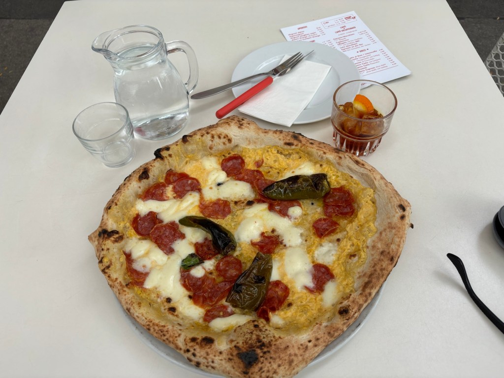 My pizza dinner was excellent! Sweet vermouth aperitif, a pitcher of water, and today’s pizza special. May have been the best pizza ever, even though it seems like an odd group of ingredients.
