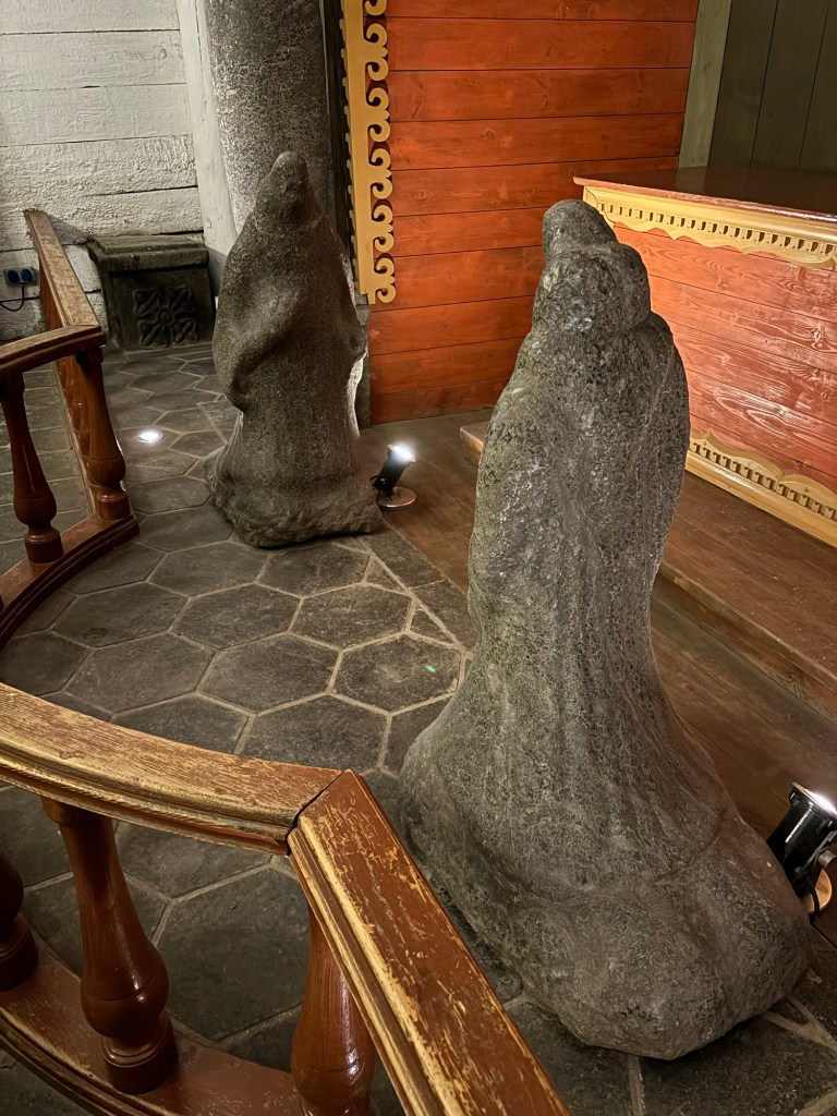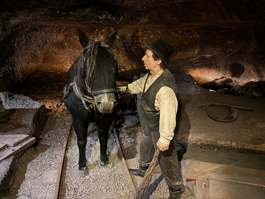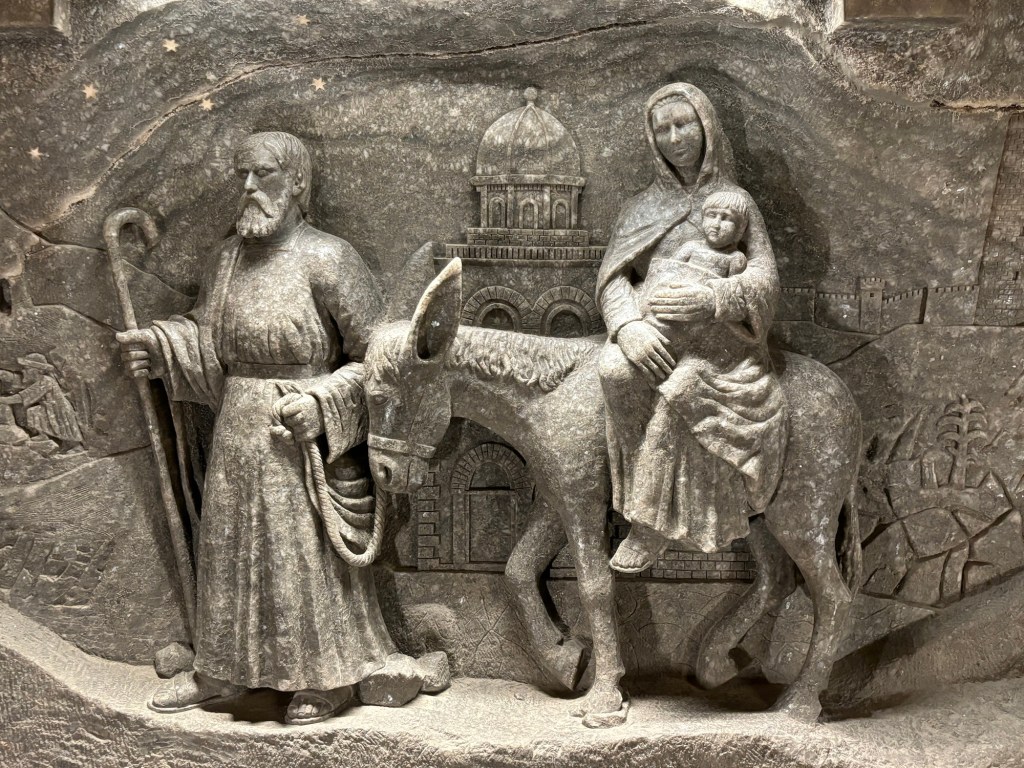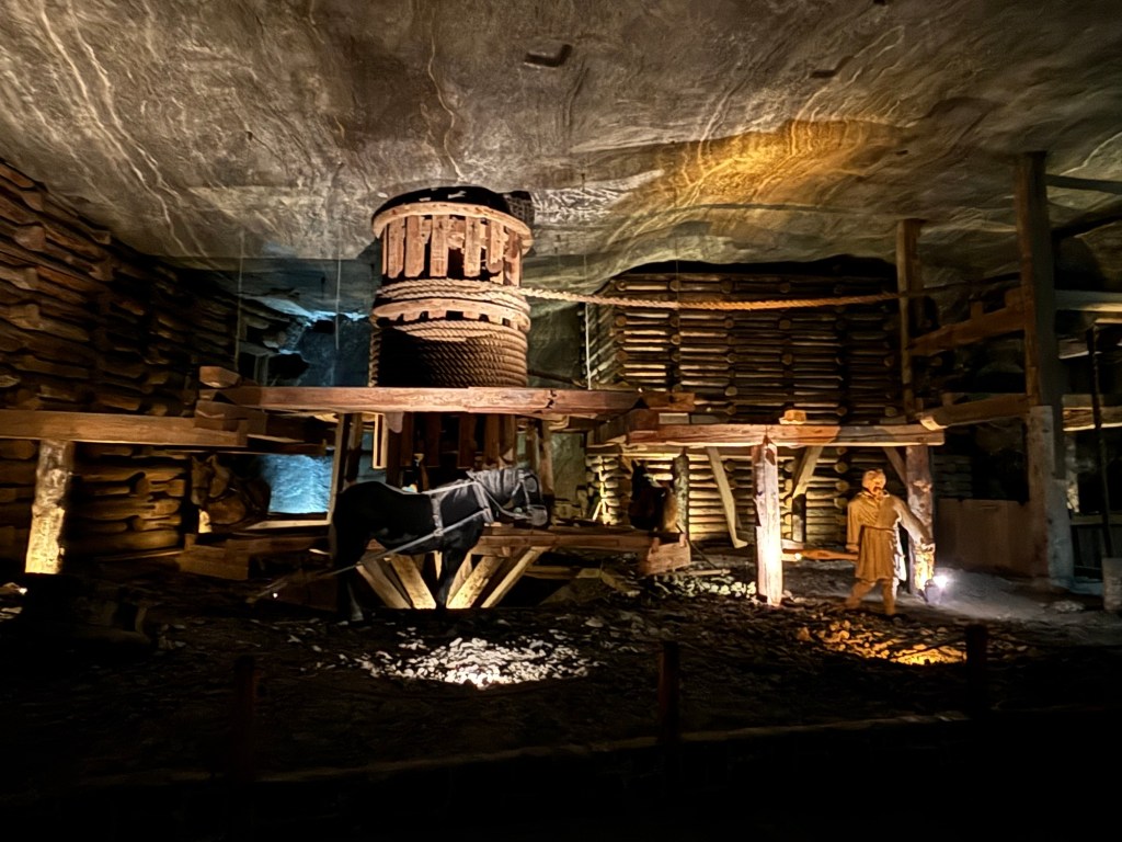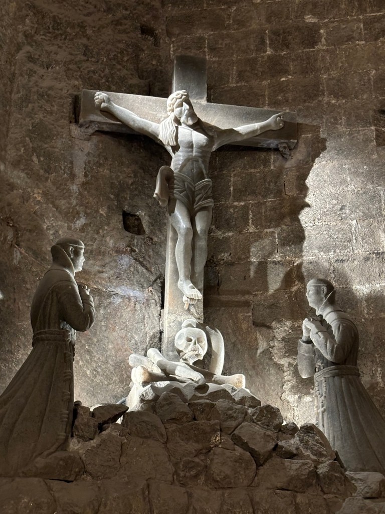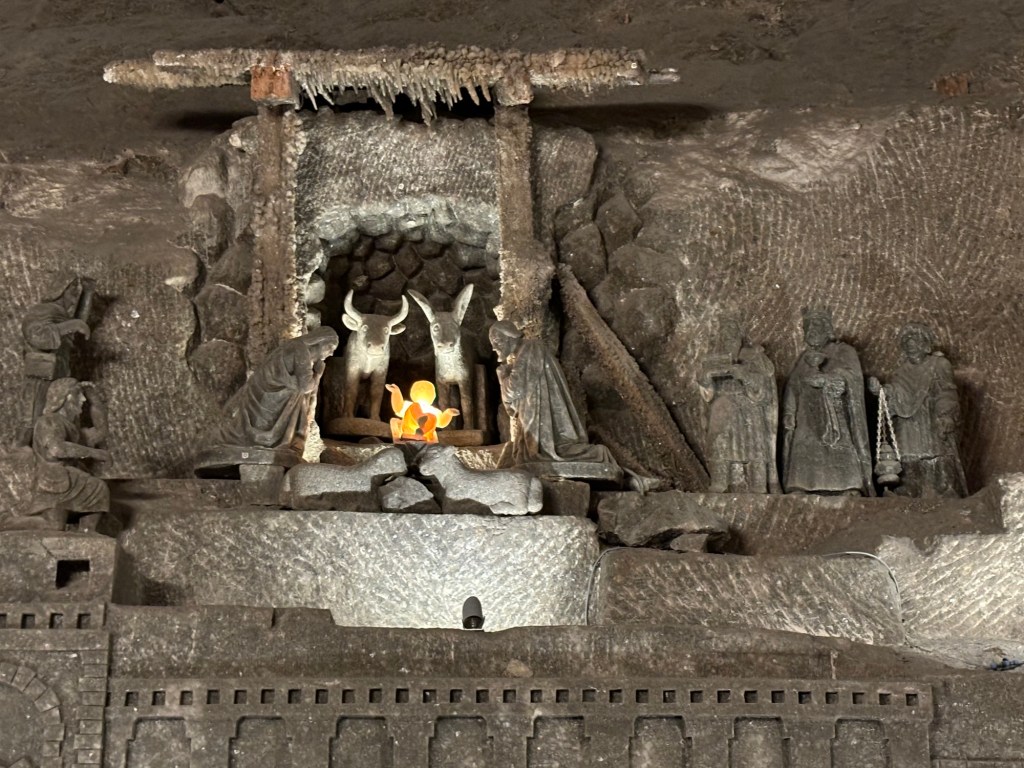 The wooden winch is 300 years old.They even used horses down in the mineSalt sculptureDepiction of salt mining six thousand years agoSalt stairsSalt floorsOld water pumpFOREMAN’S EXCAVATION INTERIOR DECOR – 17TH CENTURYThe Holy Cross Chapel – Small Sanctuary with Jesus and Mary made of wood. One of several chapels in the mine built by and for the miners.The Virgin MotherThe two munk sculptures at the altar were made of salt, but now they look like penguins – too much exposure to moisture.